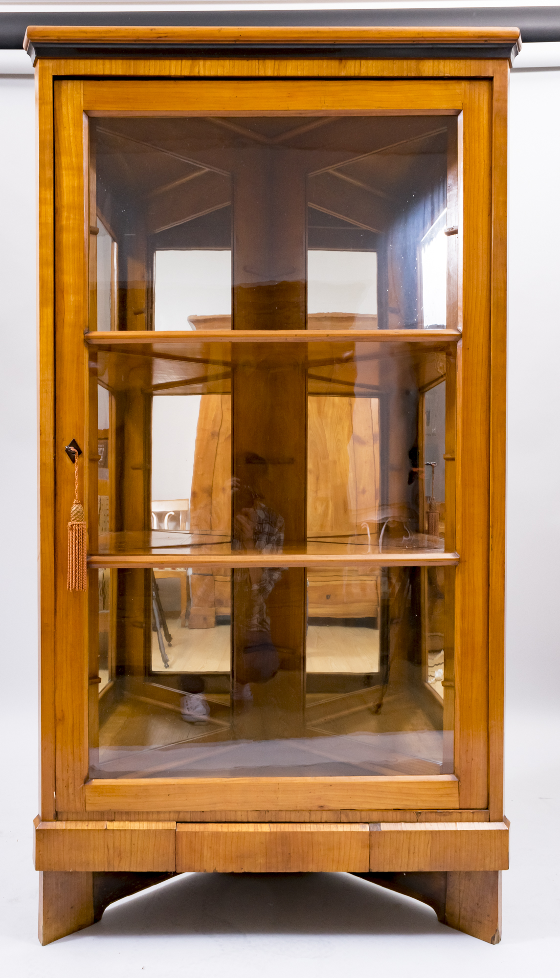 Originale Biedermeier Eckvitrine, Süddeutschland, um 1820, absolut typisches Möbel, im Schenkelinneren befinden sich Spiegel, klassische ebonisierte Schlüsselraute an der Tür, darunter ein kaum erkennbarer Schub.