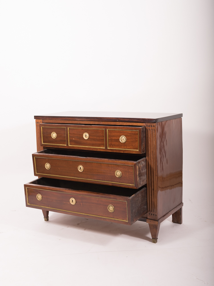 Louis Seize Kommode, um 1790, Mahagoni massiv und furniert, die obere Schubladenfront ist optisch durch Messingintarsien in drei kleine Schubladen unterteilt, Profilierungen an den Seiten, dekorierende Messingapplikationen, konisch zulaufende Vorderbeine, geradliniger, rechteckiger Korpus.