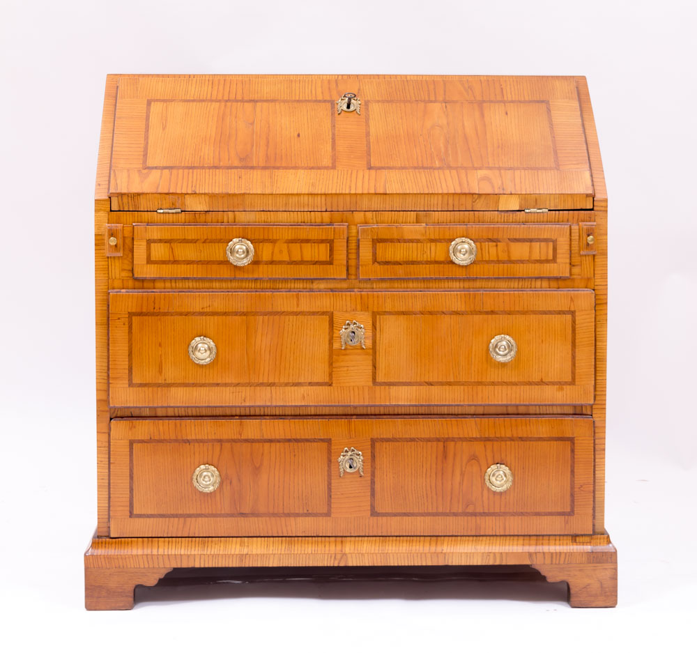 Louis Seize Schrägklappensekretär, Frankreich, um 1790, Esche furniert mit Fadenintarsien in den Schubladenfronten, originale Messingapplikationen, schlichte geradlinige Formgebung, wertvolles historisches Kleinmöbel aus einem Haushalt in Düsseldorf.
