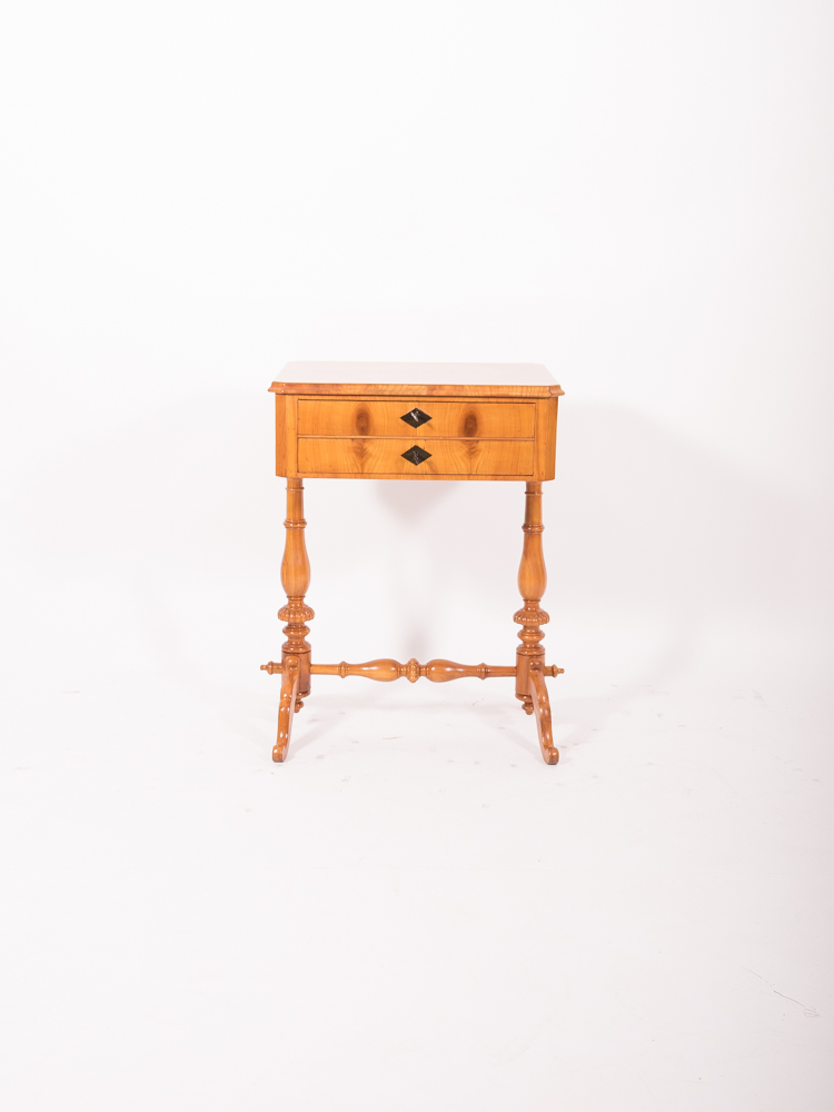 Nähtischchen, Süddeutschland, um 1840, Kirschbaum massiv und furniert, rechteckiger an allen vier Kanten abgeschrägter Zargenkasten, doppelschübige Anlage mit differenzierter Inneneinrichtung, seitliche Balusterstützen auf hohen und markant gegliederten Volutenbrückenfüßen, balustrierter Mittelfußsteg, rautenförmige Schlüsselschilder, wundervolles antikes Beistellmöbel passend zu Landhausstil und modernem Möbel, aus einem Münchner Haushalt.