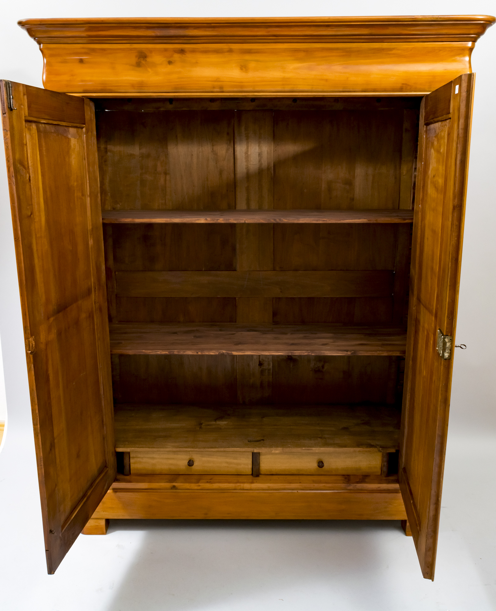 Biedermeier Kirschbaumschrank, Oberschwaben, um 1835, Kirschbaum massiv, typische ausladende Karnieschweifung des Oberteiles, 2 Schubladen innen, schlichte Formgebung, wappenförmige ebonisierte Schlüsselschilder.