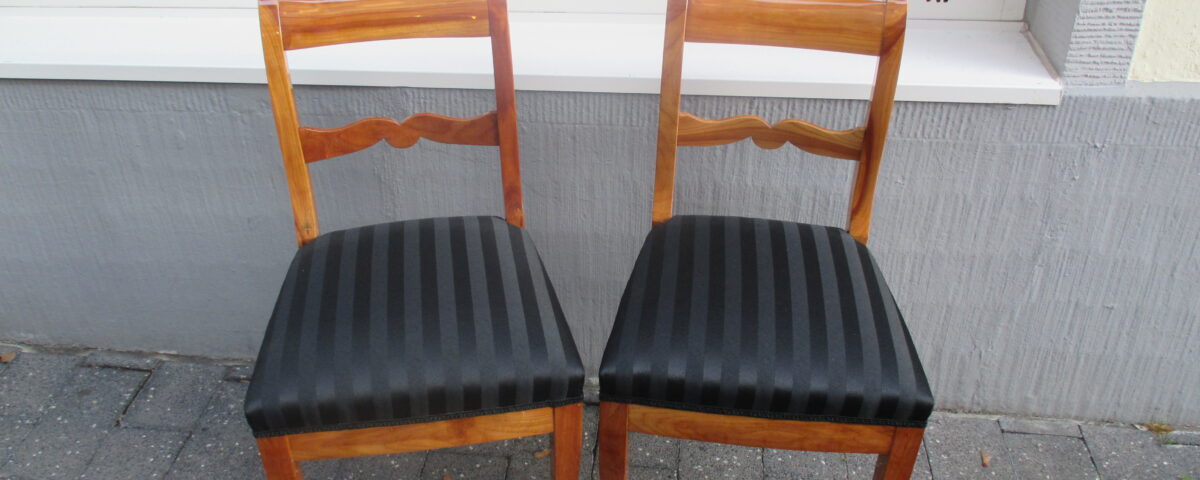 Die klassische Formgebung mit den charakteristisch schlichten, aber ausdrucksstarken Linien des Biedermeier verbindet sich harmonisch mit der modernen Polsterung in elegantem Schwarz. Diese gelungene Kombination aus historischer Substanz und zeitgemäßer Nutzbarkeit macht die Stühle zu einem besonderen Blickfang – sei es im Esszimmer, als Akzentstücke im Wohnbereich oder als stilvolle Sitzgelegenheit im Entrée.