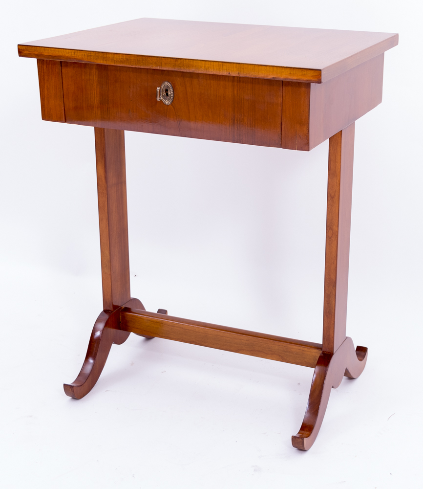 Biedermeier Nähtischchen, Süddeutschland, um 1830 , dunkles Kirschbaum massiv und furniert, rechteckiger Zargenkasten, hohe leicht ausgestellte Brückenfüße, im allgemeinen ein geradliniges Möbel, ideal kombinierbar mit moderner Einrichtung, abschließbare Schublade mit Messing-Applikation.
