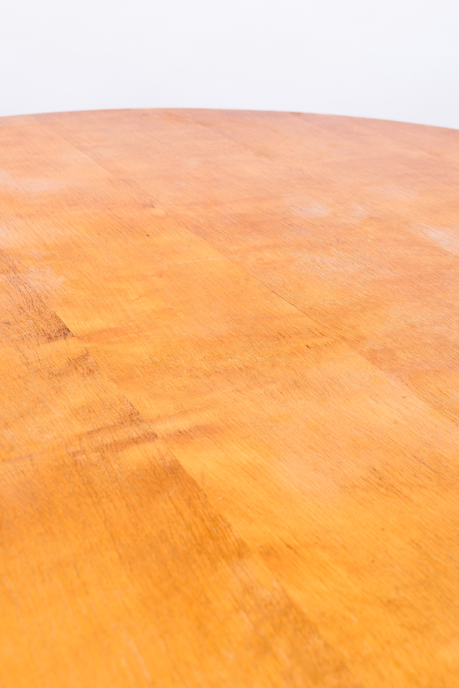 Runder Biedermeier Tisch, Nordbaden, um 1828, Birke massiv und furniert, Platte ist furniert, die kannelierte Rundsäule ist massiv auf einer vierpassigen Säulenplatte situiert.