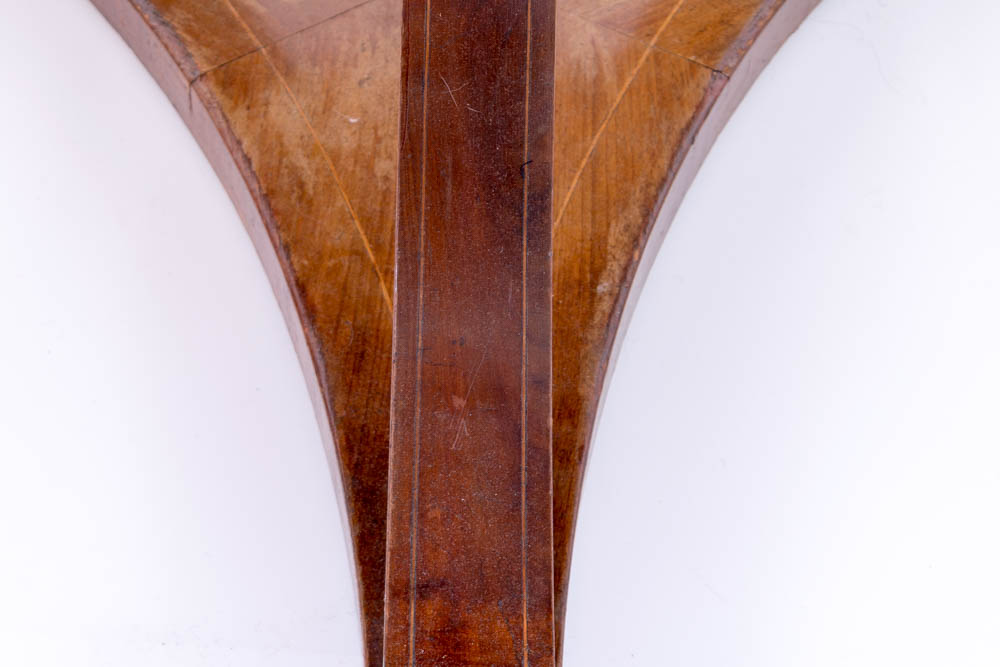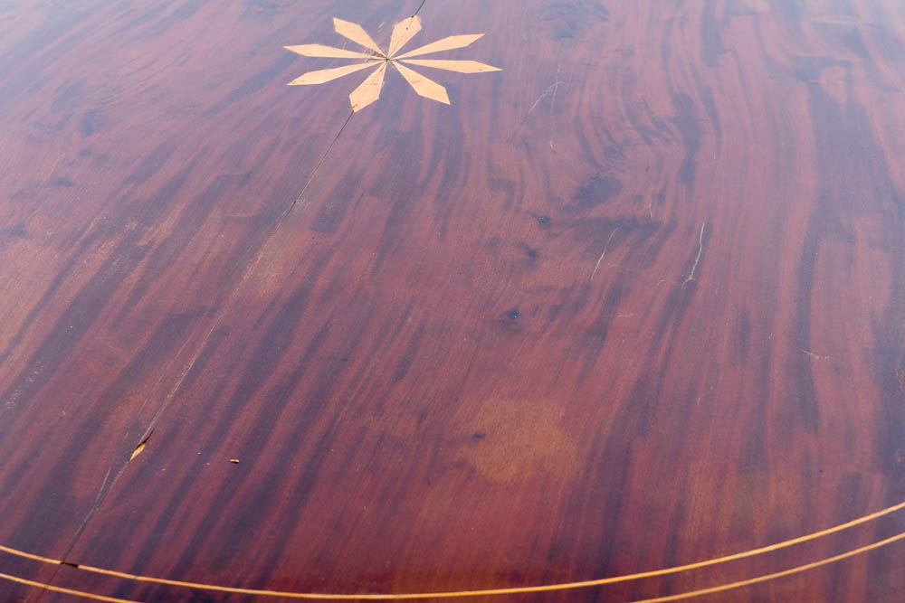 Biedermeier Tisch, Norddeutschland, um 1825/30, Mahagoni furniert, mit filigranen Bandintarsien in Ahorn, in der Plattenmitte befindet sich ein Furnierstern in Ahorn, drei weich ausgestellte Beine endend auf einer Fußplatte.