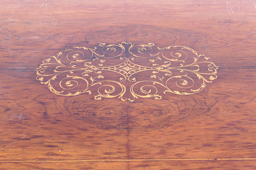 Biedermeier Salontisch, Rostock, um 1835, überaus reiche und typische Ahorn-Einlagen auf Platte und Gestell. Elegante Antiquität, Solitärmöbel passend zu moderner heller Einrichtung.