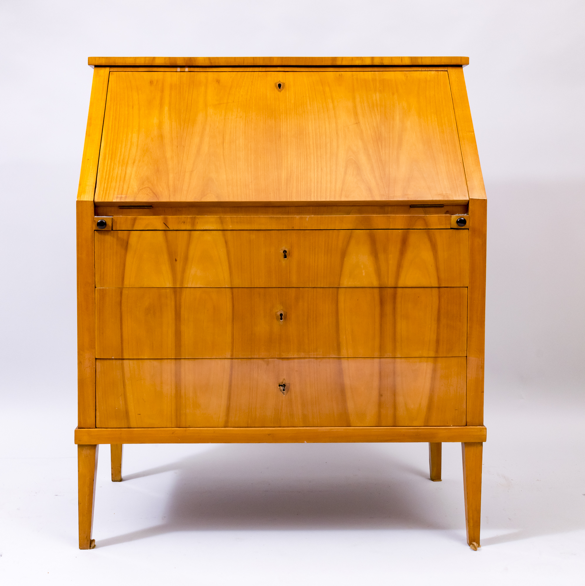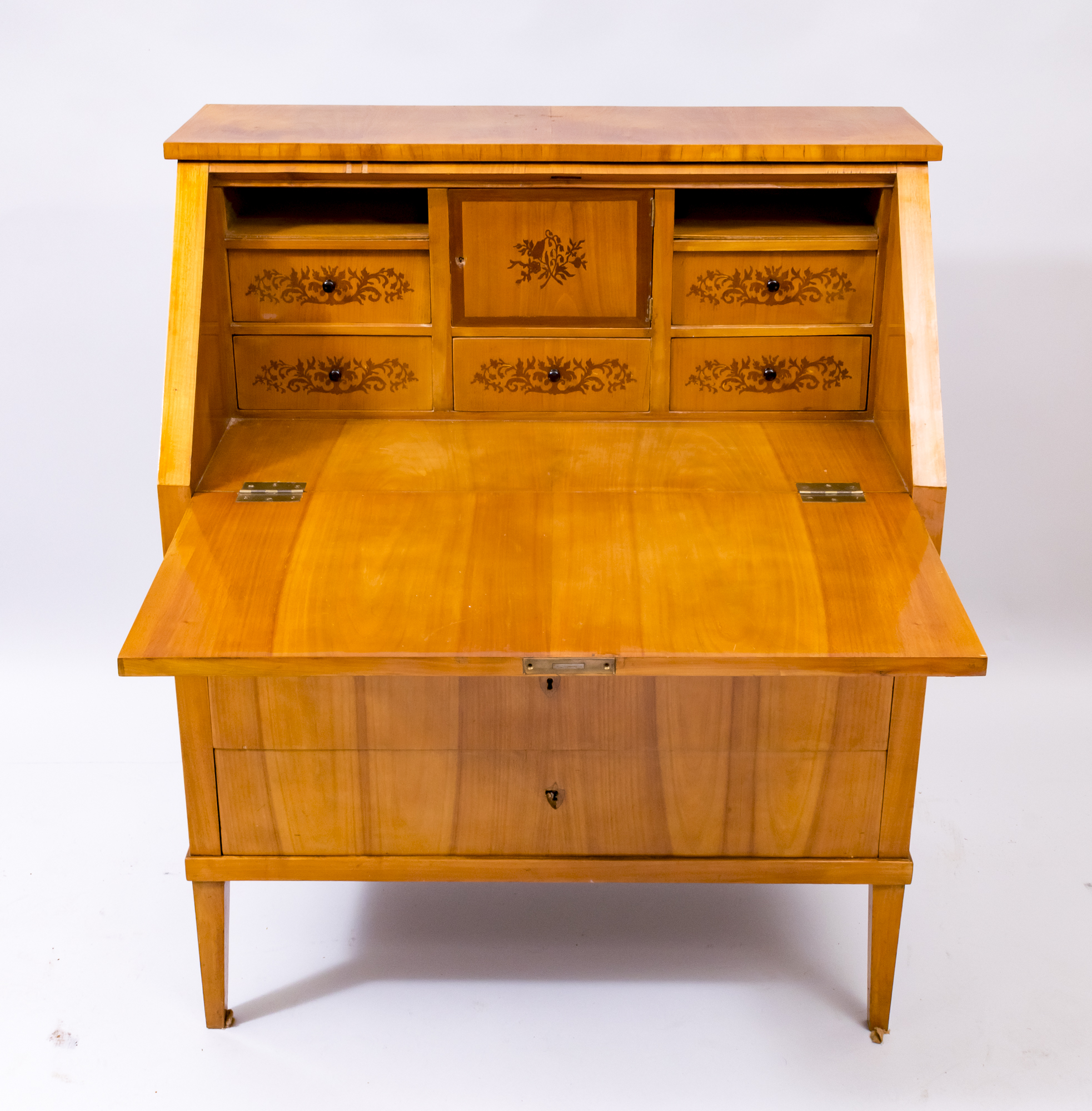 Schrägklappensekretär, Anfang um 1930, Kirschbaum massiv und furniert, die Schubladen sind mit aufwändigen Intarisen aus Pflaumenholz versehen, ein schöner kleiner Sekretär, solitäres Schreibmöbel passend zu modernem Interieur, passend für kleine Wohnungen.