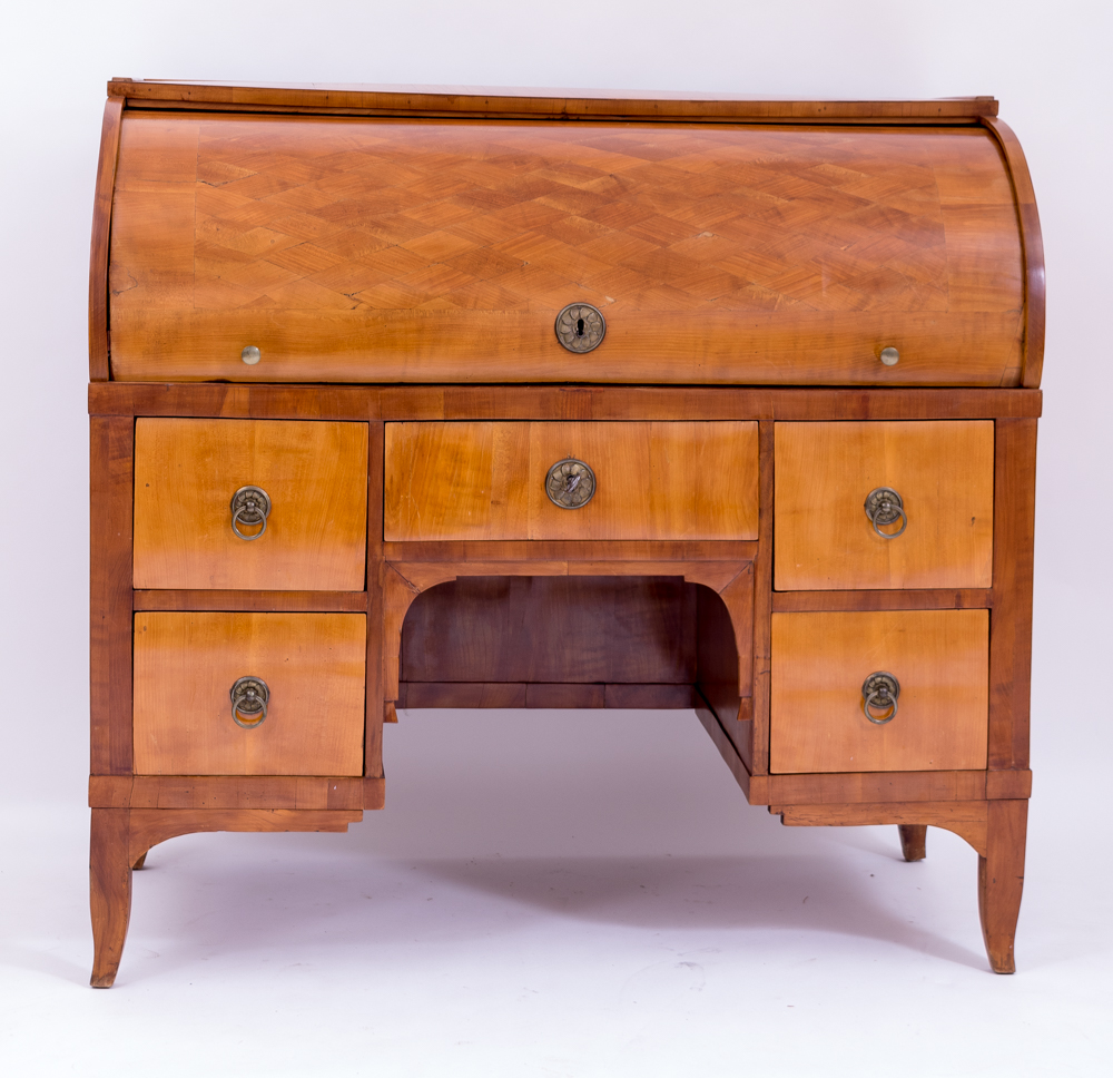 Zylindersekretär, Süddeutschland/Franken, um 1815, Kirschbaum massiv und furniert, hohe leicht ausgestellte Füße, ausziehbare Schreibplatte, originale Messingbeschläge, aussergewöhnlich seltene Anordnung der Schubladen, klares Design gepaart mit klarliniger rautenförmiger Furnierarbeit, kombinierbar zu moderner Einrichtung, aus einem Haushalt Nähe Bonn.