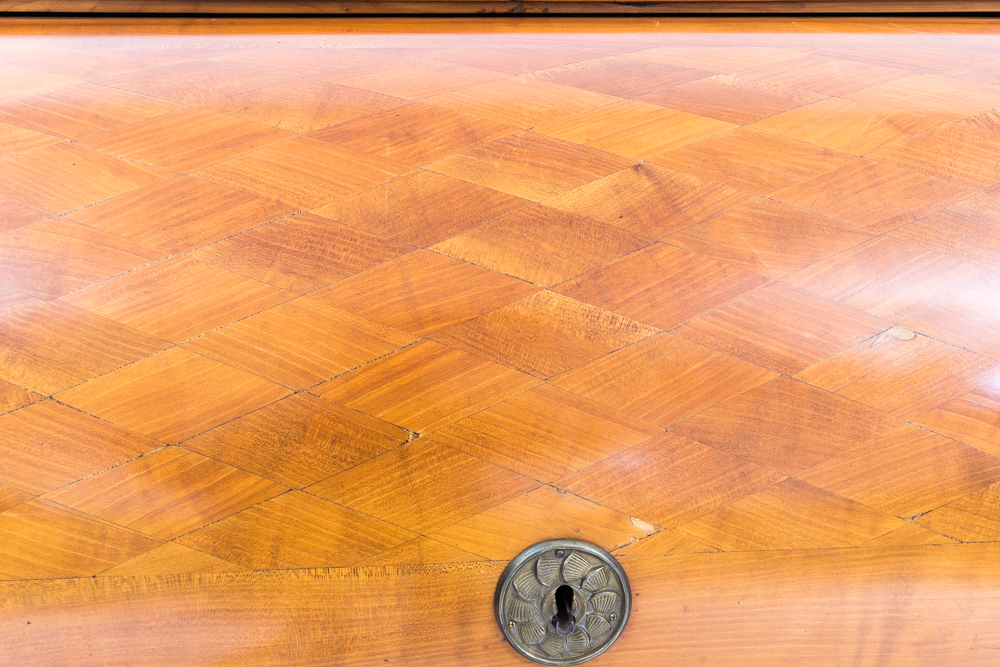 Zustand: originaler Zustand, eine Aufarbeitung der Oberfläche wäre empfehlenswert, da die Oberfläche an den Schubladen stärker verblichen ist. Bei einer Restaurierung bekäme dieses Möbel einen einheitlichen Kirschbaumton.
